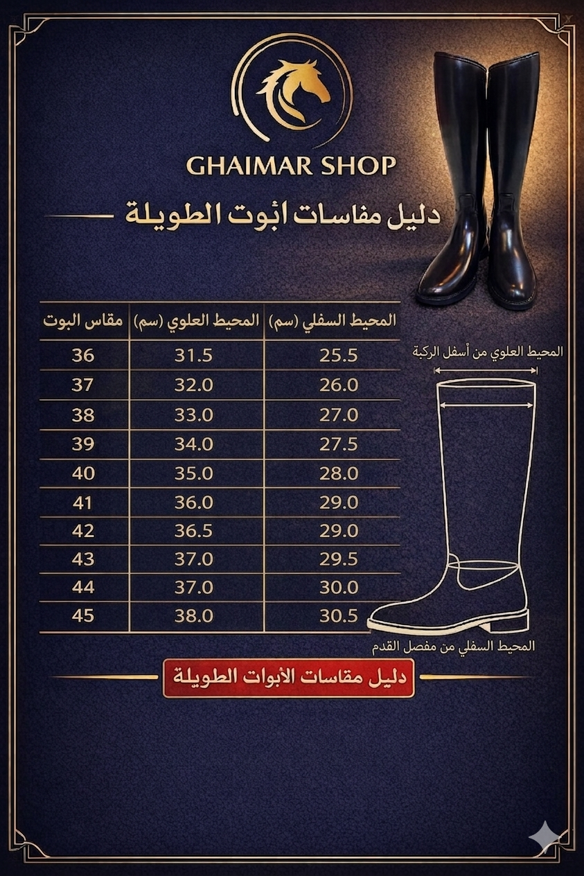 بوت ركوب طويل من الربل وببطانة داخلية ناعمة وسحاب خلفي لتسهيل عملية اللبس دون عناء ومريح في الإرتداء وموفر لحماية الساقين من احتكاك سيور الركابات ويضفي طابع أناقة الفروسية للفارس